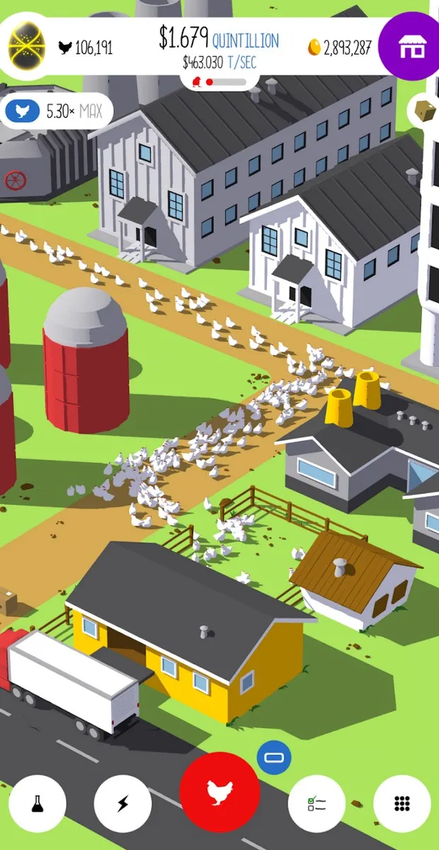 The first difference this game made compared to its peers in the same genre was its graphics. While some less successful games use only 2D graphics to save space and increase processing power, aiming to reach a wider audience, Egg, Inc. is powered by Auxbrain Inc. for its 3D graphics. Players will build enormous farms capable of housing thousands of chickens simultaneously. After a successful egg production, they can hire professional drivers to sell the eggs for profit. Furthermore, they can construct state-of-the-art research facilities to make their eggs the most prestigious in the world.